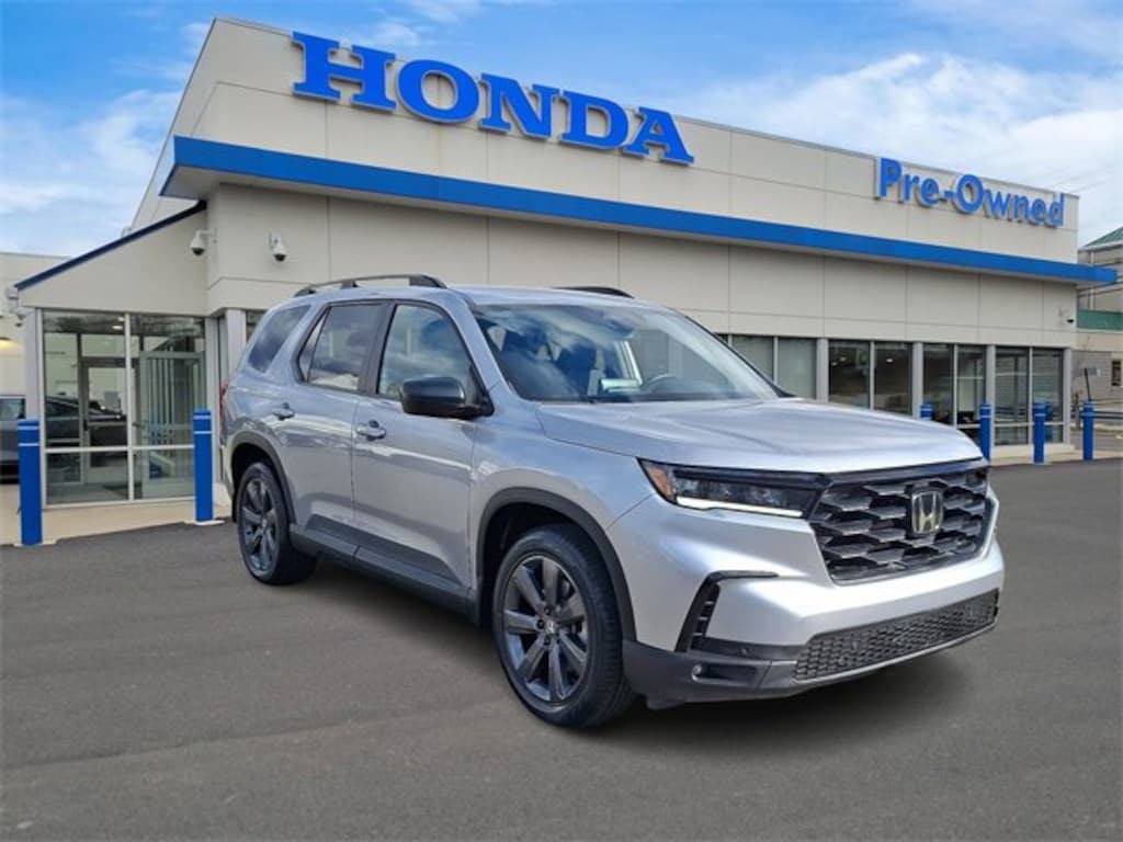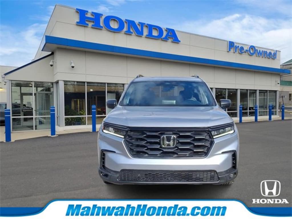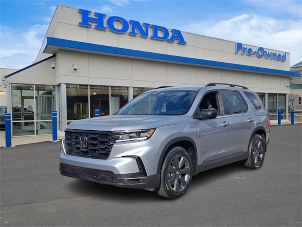 Honda of Mahwah is proud to present you with another True Market Priced Pre-Owned Vehicle. This 2025 Honda Pilot Sport is loaded with the following Factory Options: 3rd row seats: split-bench, 4-Wheel Disc Brakes, 4.167 Axle Ratio, 7 Speakers, ABS brakes, Adaptive Cruise Control: Adaptive Cruise Control (ACC) with Low-Speed Follow, Air Conditioning, Alloy wheels, Apple CarPlay/Android Auto, Auto High-beam Headlights, Automatic temperature control, Blind Spot Information (BSI) System warning, Brake assist, Bumpers: body-color, Cloth Seat Trim, Delay-off headlights, Driver door bin, Driver vanity mirror, Dual front impact airbags, Dual front side impact airbags, Electronic Stability Control, Emergency communication system: HondaLink Assist, Exterior Parking Camera Rear, Four wheel independent suspension, Front anti-roll bar, Front Bucket Seats, Front Center Armrest, Front dual zone A/C, Front fog lights, Front reading lights, Fully automatic headlights, Heated Front Bucket Seats, Heated front seats, Illuminated entry, Knee airbag, Lane departure: Lane Keeping Assist System (LKAS) active, Low tire pressure warning, Occupant sensing airbag, Outside temperature display, Overhead airbag, Overhead console, Panic alarm, Passenger door bin, Passenger vanity mirror, Power door mirrors, Power driver seat, Power passenger seat, Power steering, Power windows, Radio data system, Radio: 240-Watt Audio System, Rear air conditioning, Rear anti-roll bar, Rear reading lights, Rear seat center armrest, Rear window defroster, Rear window wiper, Reclining 3rd row seat, Remote keyless entry, Security system, Speed control, Speed-sensing steering, Speed-Sensitive Wipers, Split folding rear seat, Spoiler, Steering wheel mounted audio controls, Tachometer, Telescoping steering wheel, Tilt steering wheel, Traction control, Trip computer, and Variably intermittent wipers!!