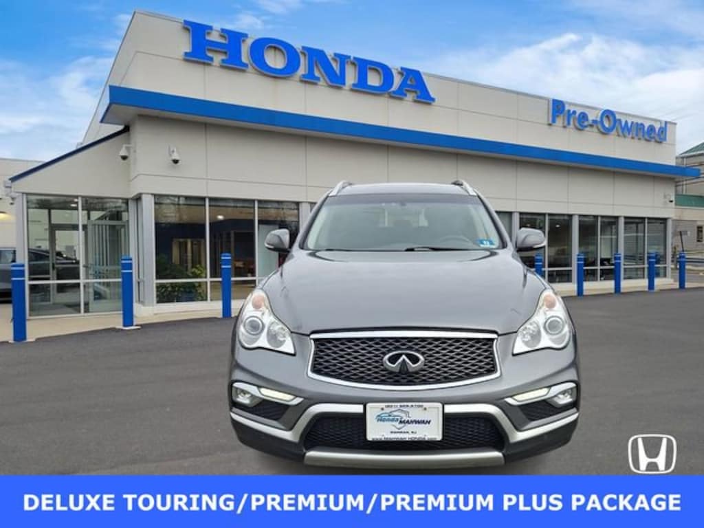 Honda of Mahwah is proud to present you with another True Market Priced Pre-Owned Vehicle. This 2017 INFINITI QX50 DELUXE TOURING/PREMIUM/ PREM PLUS PACKAGE is loaded with the following Factory Options: ABS brakes, Alloy wheels, Electronic Stability Control, Front dual zone A/C, Heated door mirrors, Heated Front Bucket Seats, Heated front seats, Illuminated entry, Low tire pressure warning, Power moonroof, Remote keyless entry, and Traction control ABS brakes, Alloy wheels, Electronic Stability Control, Front dual zone A/C, Heated door mirrors, Heated Front Bucket Seats, Heated front seats, Illuminated entry, Low tire pressure warning, Power moonroof, Remote keyless entry, Traction control, 3.133 Axle Ratio, 4-Wheel Disc Brakes, 6 Speakers, Air Conditioning, AM/FM radio: SiriusXM, Anti-whiplash front head restraints, Automatic temperature control, Brake assist, Bumpers: body-color, CD player, Delay-off headlights, Driver door bin, Driver vanity mirror, Dual front impact airbags, Dual front side impact airbags, Four wheel independent suspension, Front anti-roll bar, Front Bucket Seats, Front Center Armrest, Front fog lights, Front reading lights, Leather Shift Knob, Leather steering wheel, Leather-Appointed Seat Trim, Occupant sensing airbag, Outside temperature display, Overhead airbag, Overhead console, Panic alarm, Passenger door bin, Passenger vanity mirror, Power door mirrors, Power driver seat, Power passenger seat, Power steering, Power windows, Radio data system, Radio: AM/FM/CD w/6 Speaker Audio System, Rear anti-roll bar, Rear reading lights, Rear seat center armrest, Rear window defroster, Rear window wiper, Security system, Speed control, Speed-sensing steering, Speed-Sensitive Wipers, Split folding rear seat, Spoiler, Steering wheel mounted audio controls, Tachometer, Telescoping steering wheel, Tilt steering wheel, Trip computer, Turn signal indicator mirrors, Variably intermittent wipers, and Wheels: 18" x 8.0" 8-Spoke Aluminum-Alloy!!