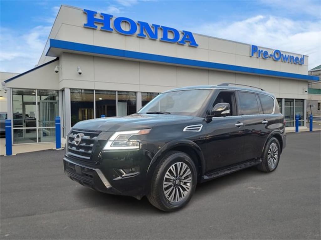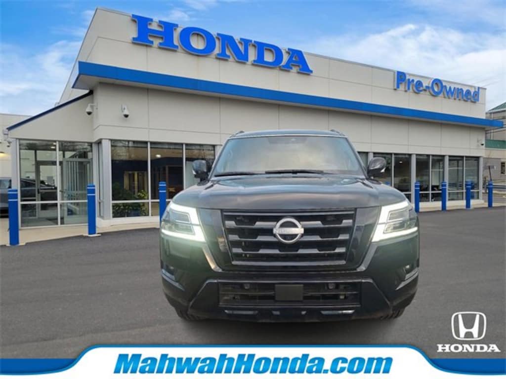 Honda of Mahwah is proud to present you with another True Market Priced Pre-Owned Vehicle. This 2022 Nissan Armada SL is loaded with the following Factory Options: 4D Sport Utility, 5.6L V8 DOHC 32V LEV3-ULEV125 400hp, 7-Speed Automatic, RWD, Super Black, and Midnight Edition Leather Captain's Chairs Package (2nd Row Captain's Chairs and 2nd Row Center Console w/Padded Armrest), Midnight Edition Package (20" x 8J Aluminum Alloy Wheels, Auto-Dimming Exterior Mirror w/LED Turn Signals, Black Painted Grille, Black Painted Roof Rails, Cargo Mat & Midnight Edition Floor Mats, Front & Rear Lower Center Bumper Fascias, Leather Appointed Seat Trim, and Rear LED Lamps w/Black Paint Finisher), 4D Sport Utility, 5.6L V8 DOHC 32V LEV3-ULEV125 400hp, 7-Speed Automatic, RWD, Super Black, Midnight Edition Leather, 13 Speakers, 2.94 Axle Ratio, 3rd row seats: split-bench, 4-Wheel Disc Brakes, ABS brakes, Air Conditioning, Alloy wheels, AM/FM radio: SiriusXM, Anti-whiplash front head restraints, Auto High-beam Headlights, Auto tilt-away steering wheel, Auto-dimming door mirrors, Auto-dimming Rear-View mirror, Auto-leveling suspension, Automatic temperature control, Brake assist, Bumpers: body-color, Delay-off headlights, Driver door bin, Driver vanity mirror, Dual front impact airbags, Dual front side impact airbags, Electronic Stability Control, Emergency communication system: NissanConnect Services, Exterior Parking Camera Rear, Four wheel independent suspension, Front anti-roll bar, Front Bucket Seats, Front Center Armrest, Front dual zone A/C, Front fog lights, Front reading lights, Fully automatic headlights, Garage door transmitter: HomeLink, Heated door mirrors, Heated Front Bucket Seats, Heated front seats, Illuminated entry, Illuminated Kick Plates, Knee airbag, Leather Shift Knob, Leather-Appointed Seat Trim, Low tire pressure warning, Memory seat, Navigation System, NissanConnect featuring Apple CarPlay and Android Auto, Occupant sensing airbag, Outside temperature display, Overhead airbag, Overhead console, Panic alarm, Passenger door bin, Passenger vanity mirror, Power door mirrors, Power driver seat, Power Liftgate, Power moonroof, Power passenger seat, Power steering, Power windows, Radio: NissanConnect w/SiriusXM, Rear air conditioning, Rear anti-roll bar, Rear reading lights, Rear seat center armrest, Rear window defroster, Rear window wiper, Reclining 3rd row seat, Remote keyless entry, Security system, Speed control, Speed-sensing steering, Speed-Sensitive Wipers, Split folding rear seat, Spoiler, Steering wheel memory, Steering wheel mounted audio controls, Tachometer, Telescoping steering wheel, Tilt steering wheel, Traction control, Trip computer, Turn signal indicator mirrors, Variably intermittent wipers, Voltmeter, and Wheels: 20" x 8J Painted Alloy!!